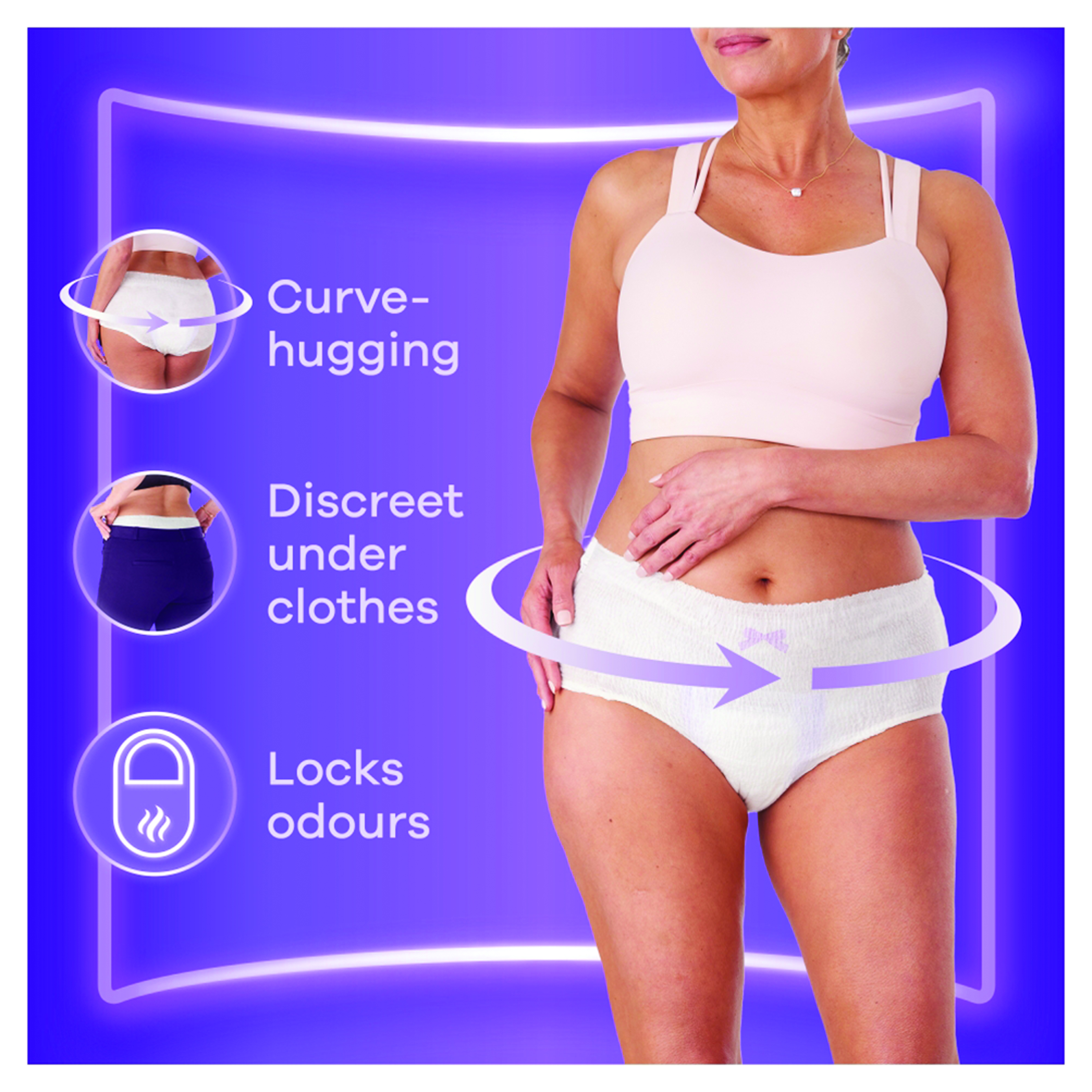 Always high-waisted incontinence underwear is designed specifically for women experiencing moderate to heavy bladder weakness. These disposable pants are engineered to look and feel like regular underwear while providing advanced protection through a thin triple-layer core. Made from soft cotton-like fabric with a feminine print, the pants hug to the curves for a smooth look under clothes. Supplied in a pack of 8.