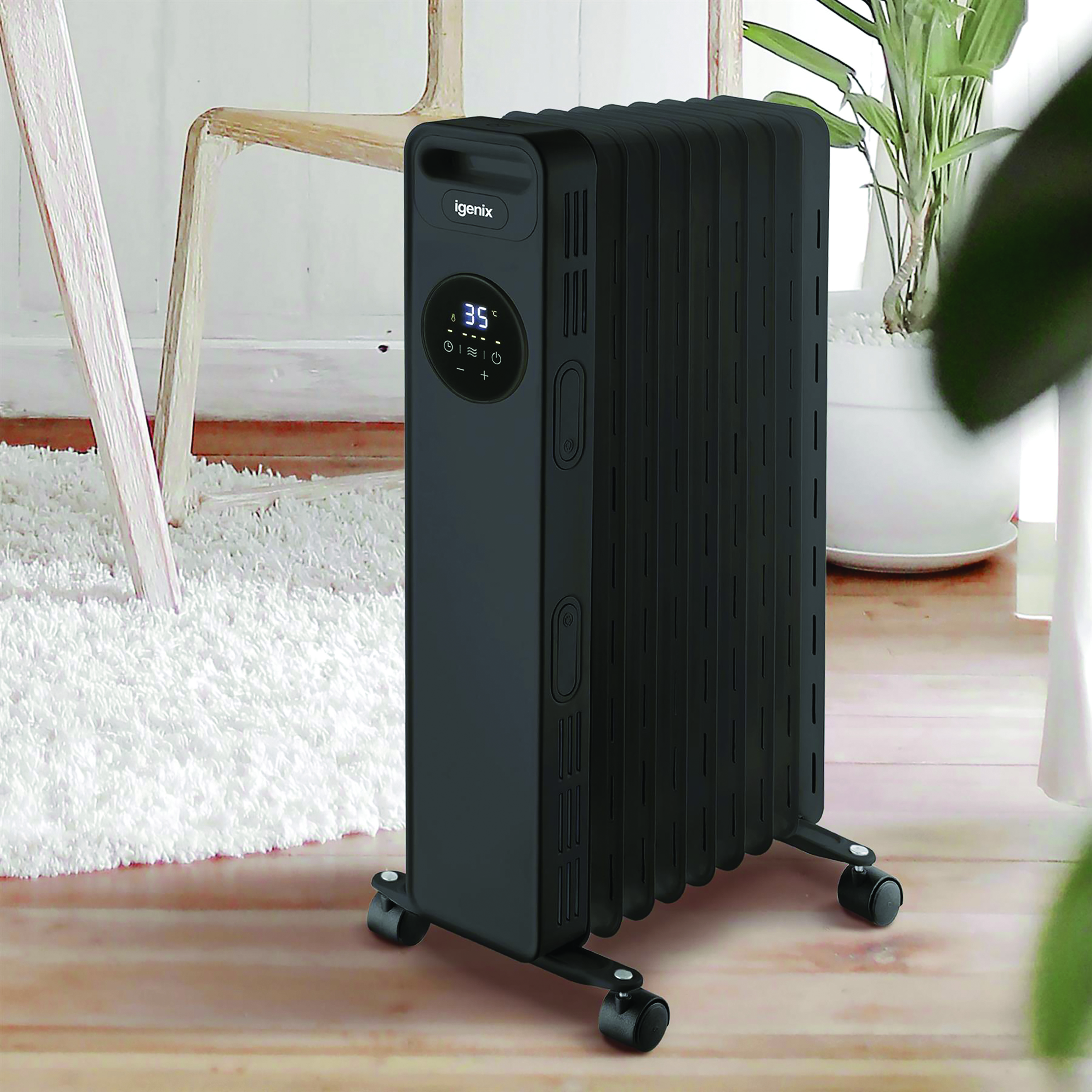The Igenix IG2621BL is a digital oil filled radiator with 2000W of power so you can keep out the cold this winter with instant heat. Save on central heating by using a portable oil filled radiator to warm up a room in a matter of minutes. The radiator has a host of features such as a digital LED control panel and remote control to easily adjust the heat, rolling castors for easy manoeuvrability around your home and a heat resistant housing to make it safe for children and pets. Adjust the radiator to make your room the perfect temperature with 3 adjustable heat settings. To make sure you can operate the radiator safely it has overheat protection and a tip over switch that will stop it overheating and automatically cut off if tipped over so you can switch on the radiator and leave it in the room to heat up without worrying.