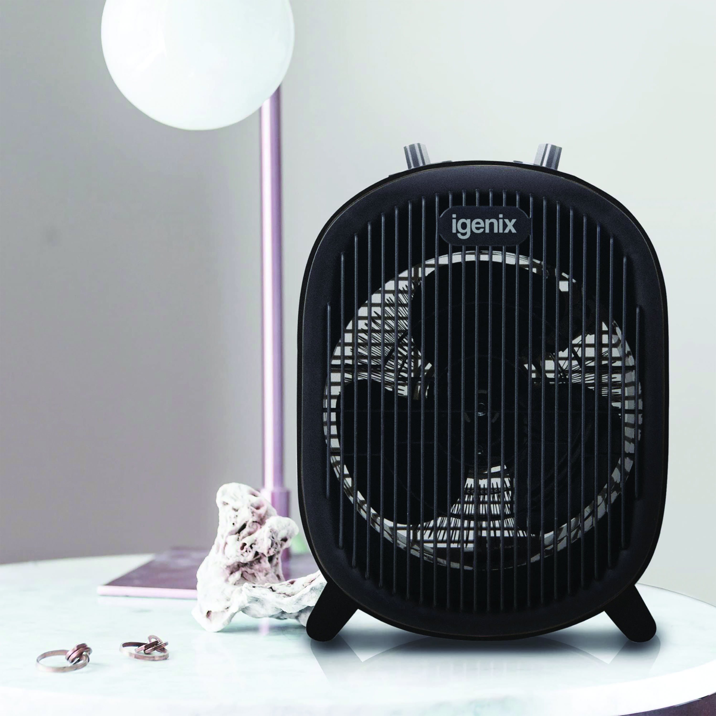 - 2 heating settings and 1 fan setting