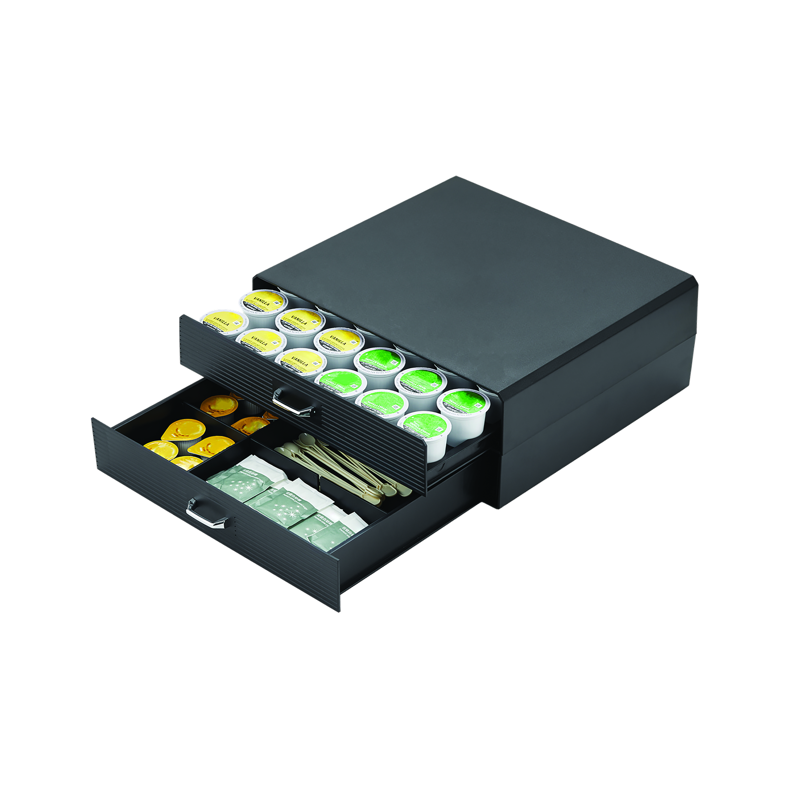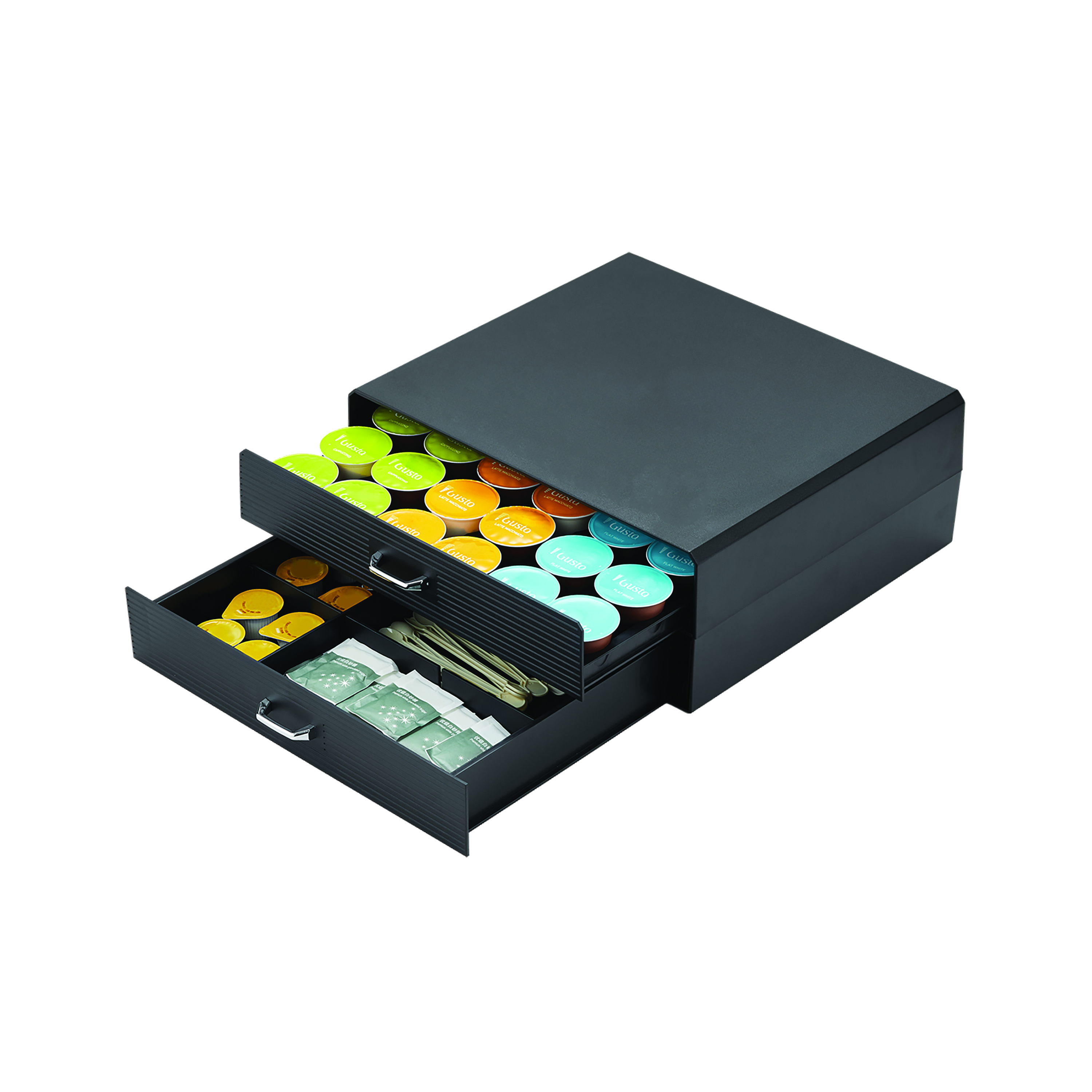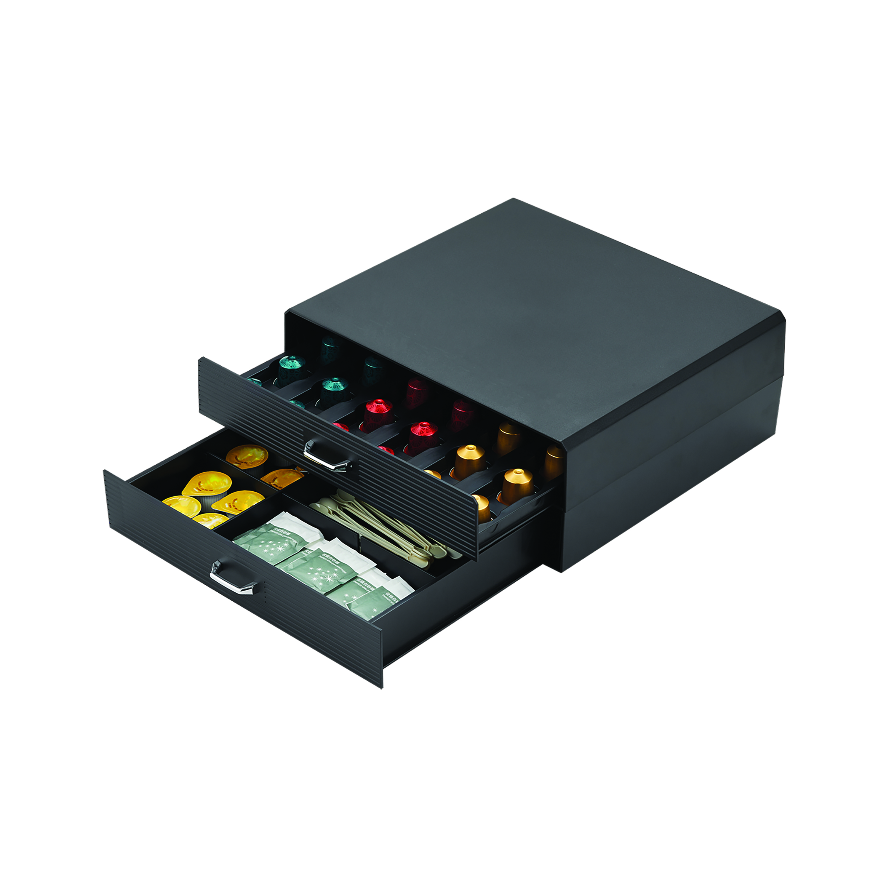 These MyCafe coffee condiment double drawers are designed to hold coffee capsules and accessories. Featuring two drawers, they are ideal for storing and displaying pods, spoons, stirrers, napkins, sugars and creamers. Supplied in black.